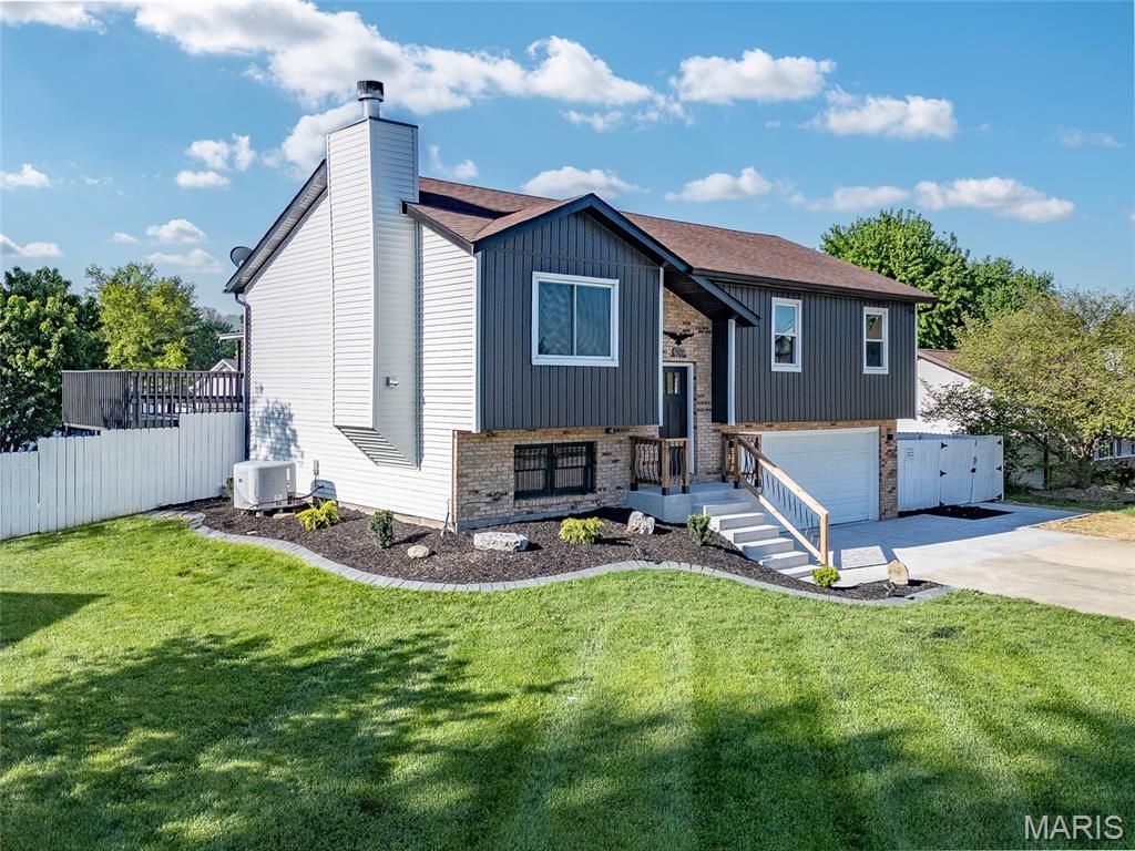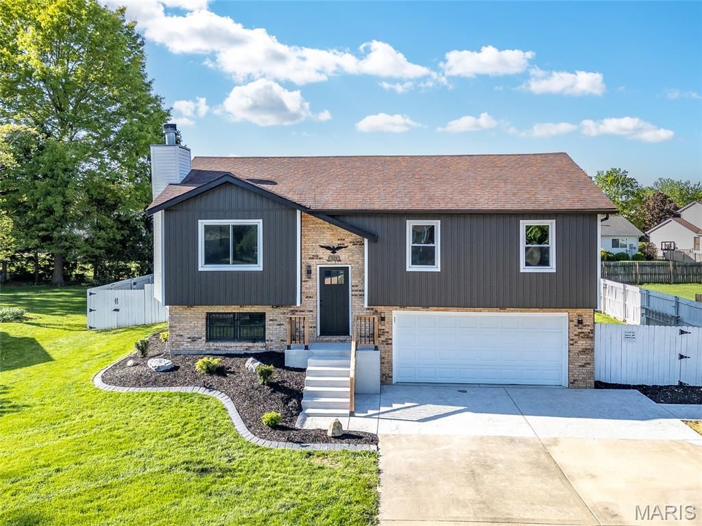 Evening Open House on Wed - April 22 from 5pm - 7pm. Stunning 3 bed / 3 bath home, loaded with stylish modern updates. Located in an established Maryville IL subdivision. Over 1900 sq ft of living space. But let's start with the real star of the show. A privacy fenced oasis backyard with impressive multi-tier deck, overlooking a crystal clear inground swimming pool with newer liner, surrounded by its own attractive wrought iron fence. There are stairs & a rail leading into the 3 ft deep end, with 8 ft deep on the far end. There's also a pool house addition on the back of the home with easy access. Will you convert it into a Tiki bar w/ a changing room or use it for extra storage? The 26 ft deep, 2 car attached garage features a handy workbench area towards the back. A double gate just off the driveway opens to reveal a paved slot behind the privacy fence for storing your boat / trailer. Inside the entry foyer, a trendy new rail & cable staircase leads you up to an open, vaulted living room w/ shiplap accent wall & woodburning fireplace. The brand new eat in kitchen features granite counters, new cabinets, breakfast bar, new stainless appliances & area for a large table. Brand new LVP flooring and carpet adorn all the rooms throughout the house. Great attention has been given to quality & detail throughout this home, including the canned lighting accents, contemporary light fixtures, faucets, ceiling fans, vanities / bowls, & door handles. The primary bedroom suite has been extended significantly. It offers a walk-in closet & private bathroom w/ shower AND also provides space for a study or lounging. 2 more updated bedrooms and a full hall bath complete the main level. Downstairs is a big gathering room with lookout windows and a lavish new electric linear fireplace. This large space could be easily subdivided into a family room & rec room, or maybe a 4th bedroom. A convenient updated 3rd bathroom w/ shower and a finished laundry room round out the lower level. No HOA. Less than a minute from the Maryville Grade School. 30 minutes from Scott AFB. 20 minutes from downtown St Louis. Showings begin April 22nd.